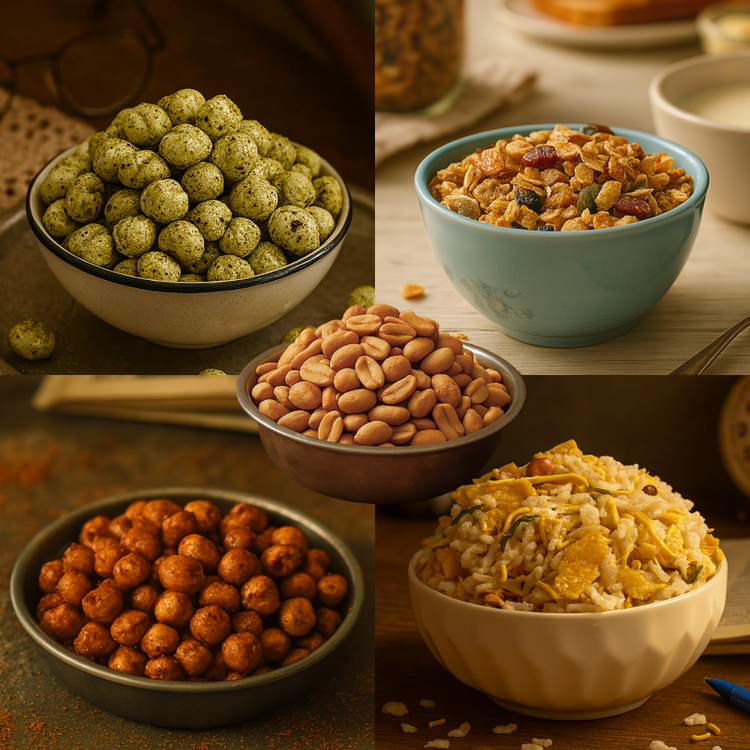 Diet Chiwda (Ground-nut Oil, Chivda, Curry Leaves, Chana Dal, Ginger Powder, Salt, Peanuts, Cashews, Haldi, Desi-Khand, Amchur Powder, Degi Mirch, Black Mustard)